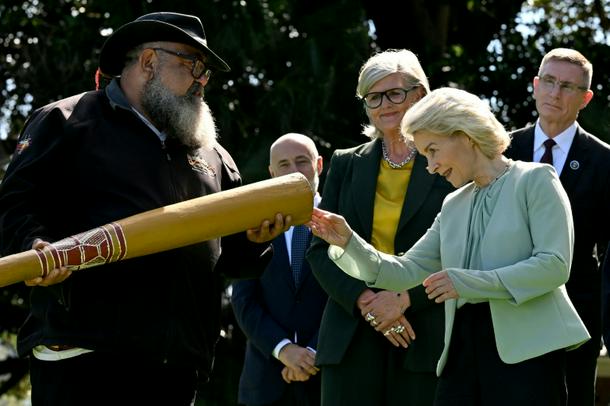 European Commission President Ursula von der Leyen (2nd R) examines a didgeridoo with Australia's Governor-General Sam Mostyn (C) during a traditional Aboriginal welcome ceremony at Admiralty House in Sydney