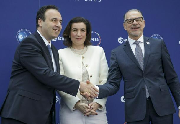 ESA chief Josef Aschbacher (right), with Greek digital governance minister Dimitris Papastergiou and German's aerospace minister Dorothee Baer