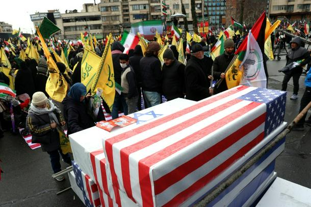 The pro-government demonstrators in Tehran piled symbolic coffins in the colours of the US and Israeli flags on each other