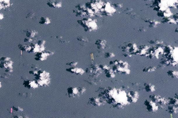 This handout satellite image released by the European Space Agency (ESA) shows two vessels conducting what appears to be an offshore cargo transfer off the southeast coast of the Malay Peninsula near Singapore on April 3