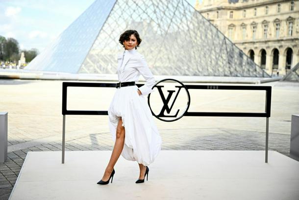 L'actrice américaine Zendaya pose devant la Pyramide du Louvre, avant le défilé Louis Vuitton, à Paris, le 10 mars 2026