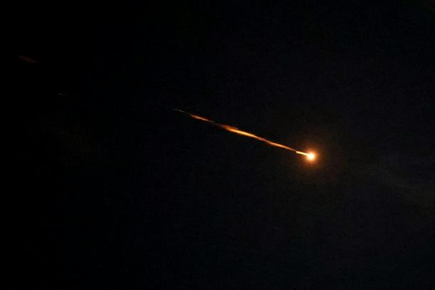 Rocket trails are seen in the sky above the Israeli coastal city of Netanya amid a fresh barrage of Iranian missile attacks
