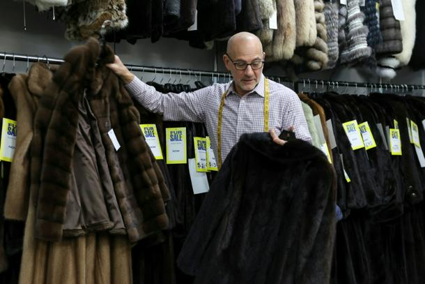 Owner of Madison Avenue Furs Larry Cowit assists a customer in his store, which has seen an uptick in interest in vintage fur in recent years