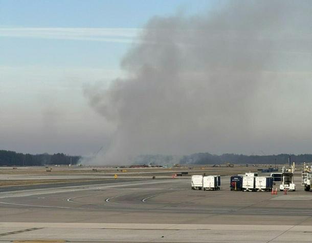 Brush burns near a runway at Dulles Airport outside Washington after a plane experienced engine failure during takeoff