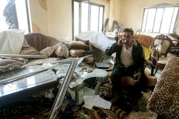 A man drinks tea inside his damaged house after returning to his hometown of Qana in southern Lebanon
