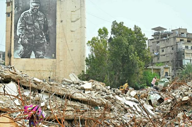 A resident inspects the rubble of destroyed buildings on his return to the southern Lebanese city of Nabatieh