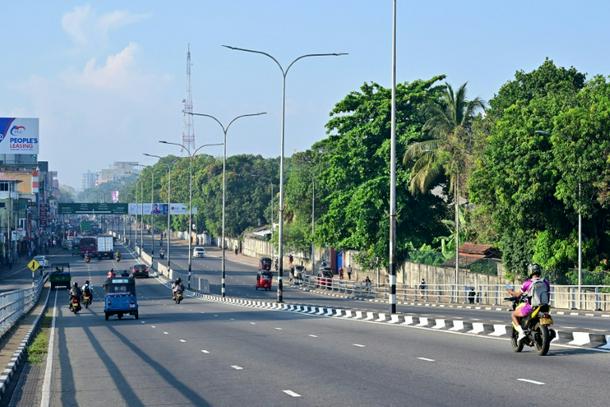 Commuters ride along a deserted street in Colombo on March 25, 2026. Sri Lanka has ordered street lights, neon signs and billboard lighting to be switched off as part of measures to cut energy consumption by 25 percent.