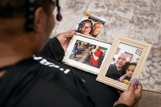 Stephanie Fairweather looks at pictures of her late brother Denton Loudermill Jr. in Olathe, Kansas, on November 12, 2025