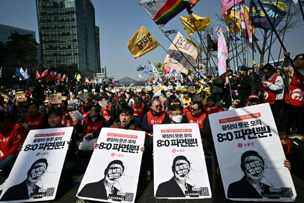 Anti-Yoon protesters wait for the Constitutional Court's verdict on the impeachment of South Korea president Yoon Suk Yeol in Seoul on April 4, 2025