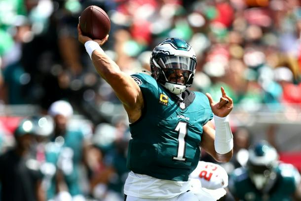 Philadelphia Eagles quarterback Jalen Hurts throws against the Tampa Bay Buccaneers in an NFL victory in Florida