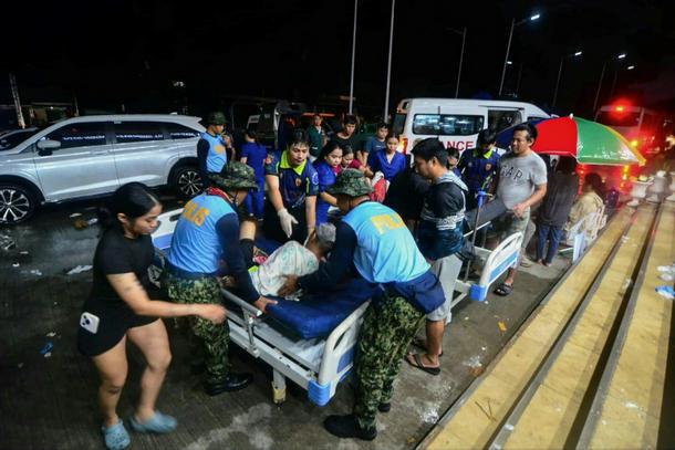 Police assist injured residents as they are brought to the hospital in Bogo City, Cebu province, central Philippines