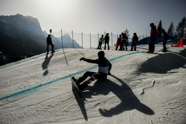 Athletes inspecting the course before competing in the snowboard cross event during the Milan-Cortina 2026 Paralympics