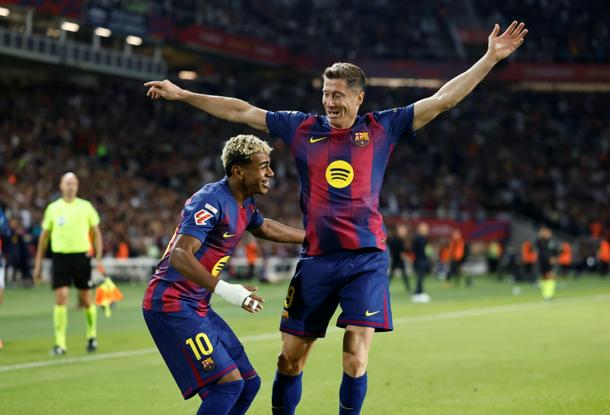 Barcelona's Polish forward Robert Lewandowski celebrates with Lamine Yamal after the winger set him up to score against Real Sociedad