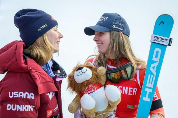 Second-placed Mikaela Shiffrin (L) and winner Switzerland's Camille Rast speak after the World Cup slalom in Kranjska Gora, Slovenia