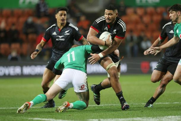 Cameron Suafoa of the New Zealand Maori is tackled during the rugby union match between the New Zealand Maori and Ireland at Waikato Stadium in Hamilton on June 29, 2022.