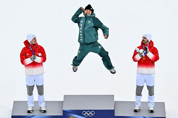 Brazil's Lucas Pinheiro Braathen (C) leaps onto the podium flanked by Switzerland's Marco Odermatt (L) and Loic Meillard (R)