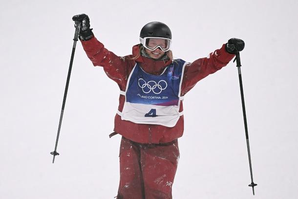 Canada's Megan Oldham celebrates victory in the women's freeski big air final at the Milan-Cortina Olympics