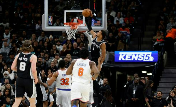 San Antonio Spurs star Victor Wembanyama dunks over the New York Knicks defense