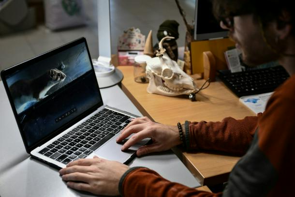 Doctoral student Marco Granata studies videos of ermines who enter his camera traps placed in the Italian Alps.