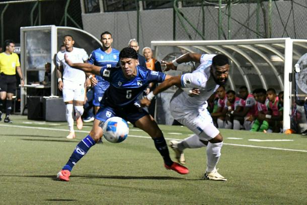 Nicaragua defender Justing Cano and Honduras forward Jorge Benguche fight for the ball during a CONCACAF 2026 World Cup qualifier