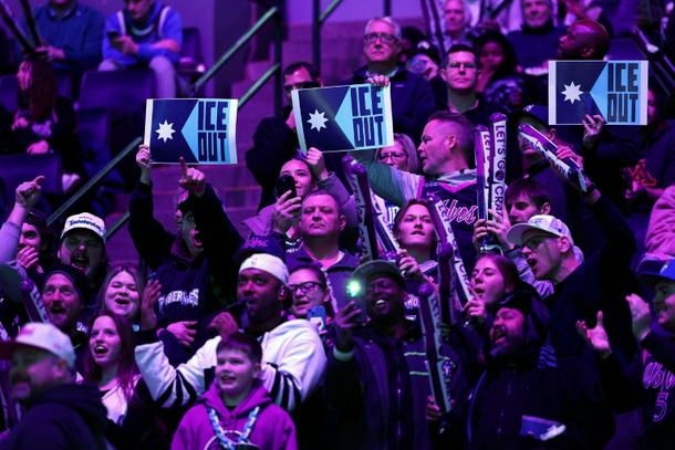 Fans hold signs protesting the presence of federal immigration agents in Minneapolis during the NBA game between the Minnesota Timberwolves and Golden State Warriors