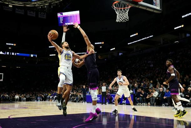 Golden State star Stephen Curry rises for a shot against Rudy Gobert in the Warriors' NBA victory over the Minnesota Timberwolves