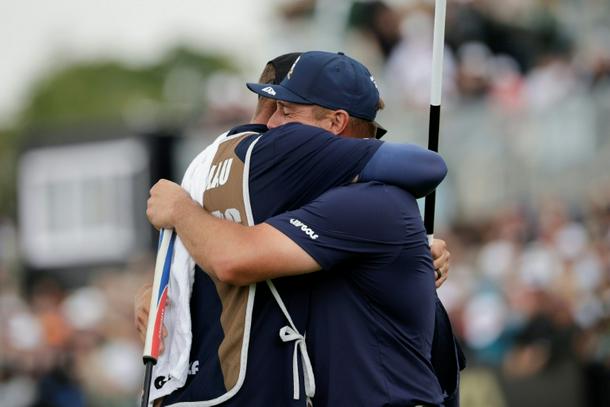 Bryson DeChambeau (R) hugs his caddie after winniing the LIV Golf South Africa title.