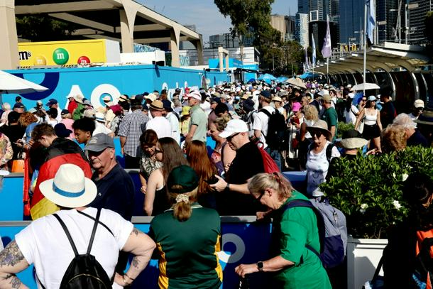 Fans queue to enter Melbourne Park on day three of the Australian Open