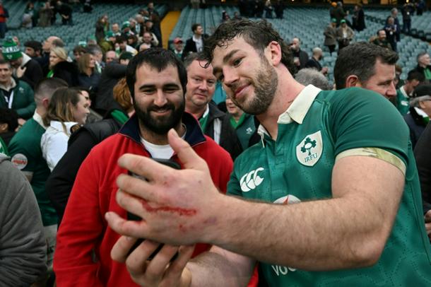 Ireland captain Caelan Doris poses for a photograph with a fan following a 42-21 Six Nations win over England at Twickenham