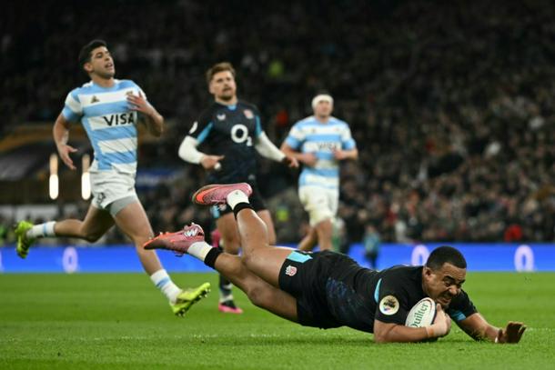 Max Ojomoh dives over the line to score the first try in England's 27-23 Autumn Nations Series win over Argentina at Twickenham