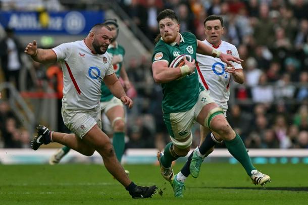 England prop Ellis Genge (L) chases Ireland lock Joe McCarthy (C) during a 42-21 Six Nations loss at Twickenham