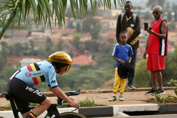 Evenepoel was last down the ramp in Kigali and set off fast, opening up a 45 second lead already at the first time check.