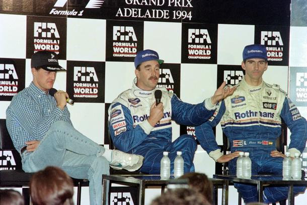 Michael Schumacher (left) and Damon Hill (right) at a tense eve-of-race press conference in Adelaide