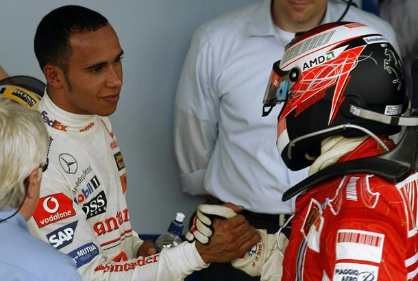 A magnanimous Lewis Hamilton congratulates Kimi Raikkonen after the Finn beat him to the title by one point