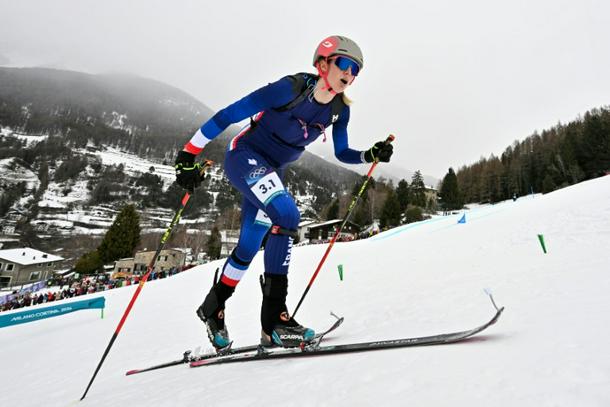 France's Emily Harrop competes in the Olympic mixed relay ski mountaineering in Bormio