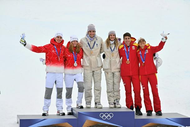 (From L) Switzerland's Jon Kistler and Marianne Fatton , France's Thibault Anselmet and Emily Harrop, and Spain's Oriol Cardona Coll and Marianne Fatton