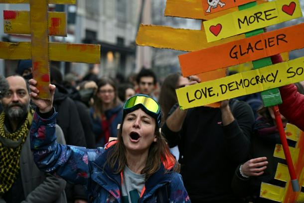 Protesters had earlier held up banners slamming a range of issues, from the use of artificial snow and tree felling, to a housing crisis in the country’s financial and fashion capital.