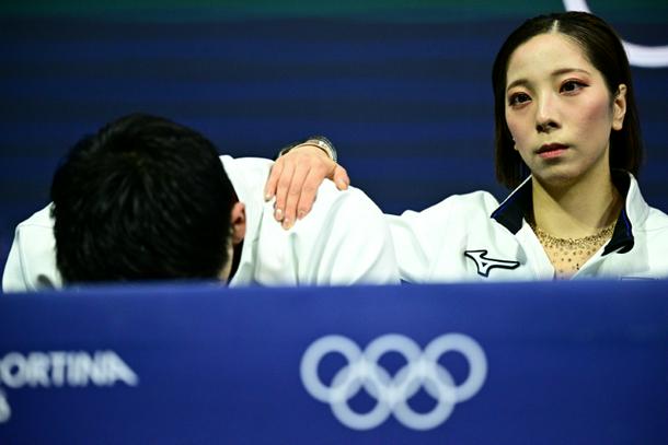 Japanese figure skater Riku Miura consoles pairs partner Ryuichi Kihara after placing fifth in the short programme at the Winter Olympics