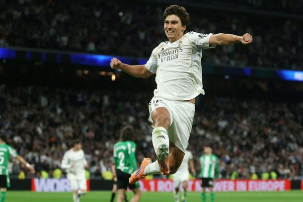 Real Madrid's Spanish forward Gonzalo Garcia celebrates scoring his second goal in the win over Real Betis on Sunday in La Liga