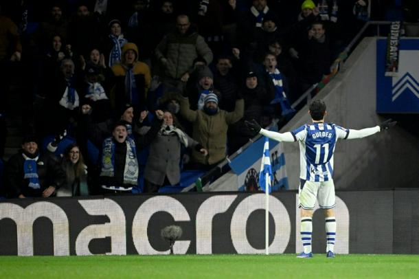 Real Sociedad's Portuguese forward Goncalo Guedes celebrates scoring in the draw against Atletico Madrid on Sunday