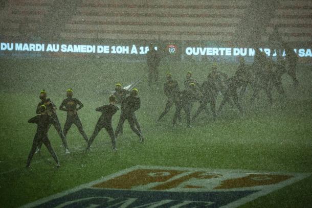 There was a thick layer of water on the pitch, and flooding into the tunnel and changing rooms, but dancers performed in the rain before the French Top 14 match between Toulon and La Rochelle