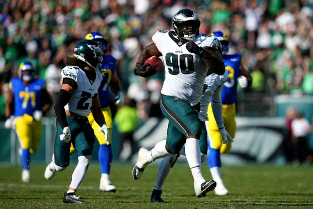 Philadelphia's Jordan Davis returns a blocked field goal for a touchdown against the Los Angeles Rams on the final play to give the Eagles a 33-26 NFL victory in a showdown of unbeatens