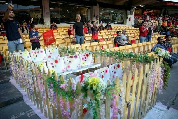TV images of the cordoned area of 11 seats covered with white cloth and flower petals with a black stone engraved to honour the dead fans were shown ahead of the game.