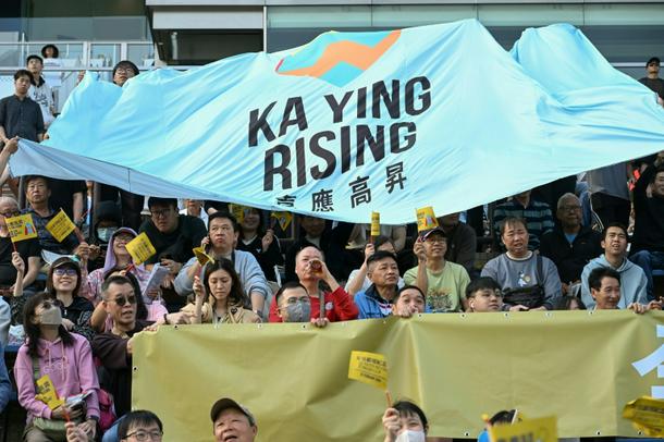 Fans of race horse Ka Ying Rising cheer ahead of the Queen's Silver Jubilee Cup horse race at Sha Tin Racecourse in Hong Kong on February 22, 2026. Ka Ying Rising on February 22 is bidding to win his 18th race in a row, to break the Hong Kong record held by Silent Witness.