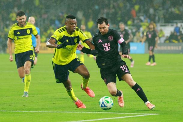 Inter Miami's Lionel Messi, at right battling for the ball with Nashville's Jeisson Palacios, was among those named to the MLS Best XI for the 2025 season