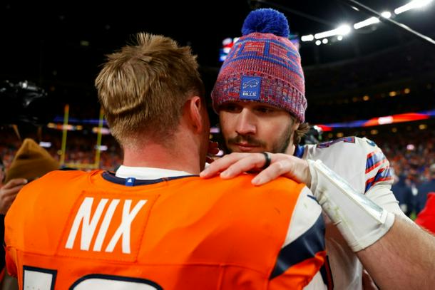 Denver quarterback Bo Nix consoles Buffalo counterpart Josh Allen after the Broncos overtime victory