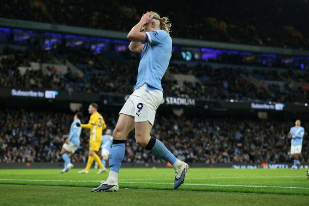 Manchester City's Erling Haaland reacts after missing a chance against Brighton