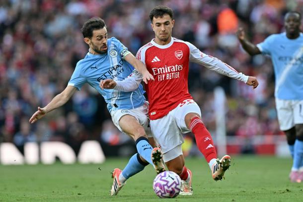 Manchester City's Bernardo Silva (L) in action against Arsenal