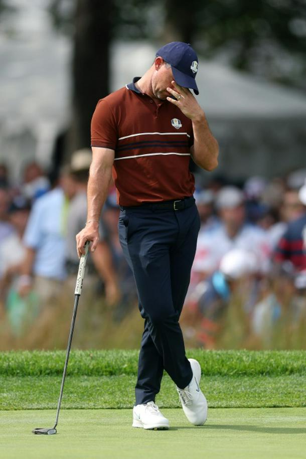 Rory McIlroy, a tremendous target for hecklers, hangs down his head on the seventh green in a four-balls match at the 45th Ryder Cup