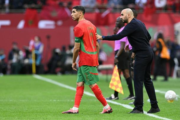 Morocco captain Achraf Hakimi with coach Walid Regragui during the narrow win over Tanzania in the last 16 of the Africa Cup of Nations